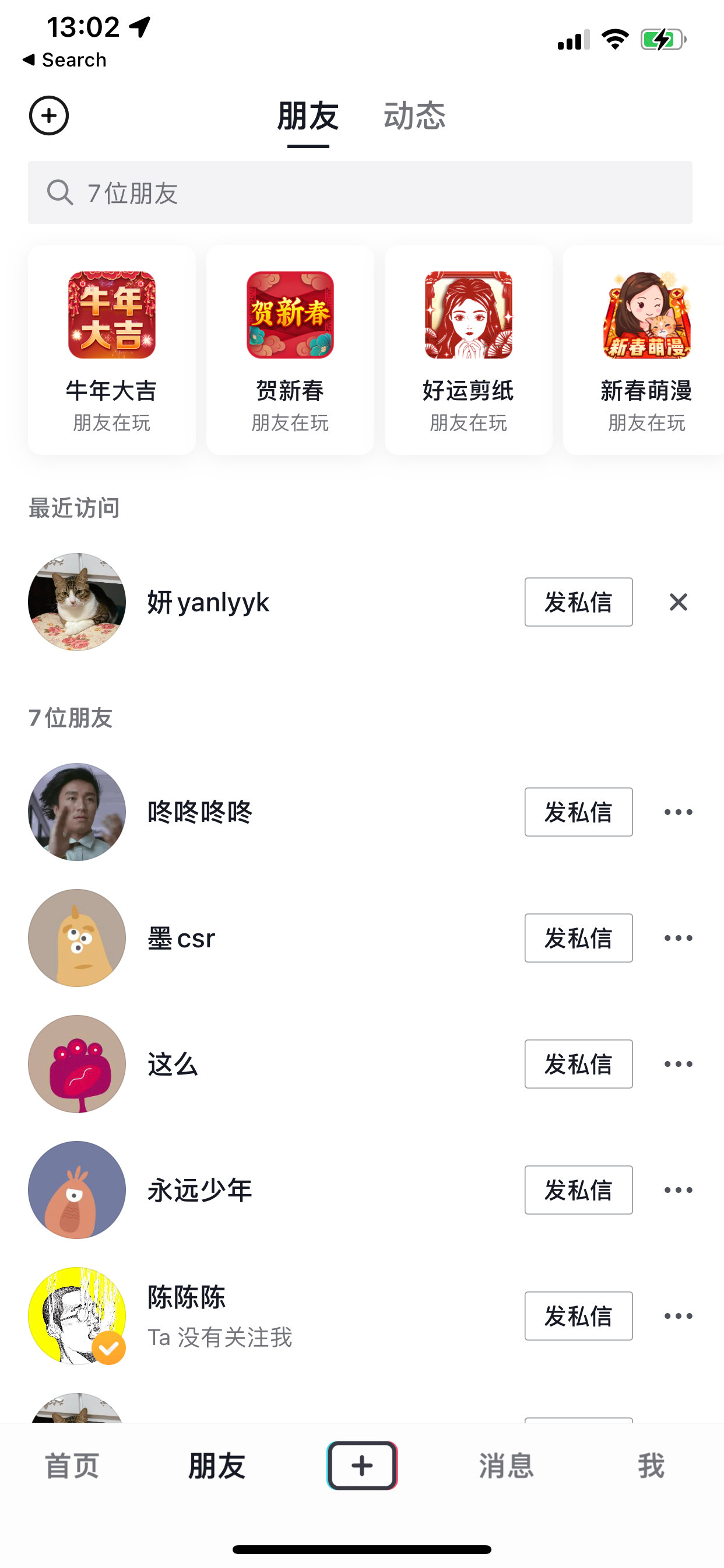 抖音在底部第二个 Tab “朋友”中增加通讯录功能,和原有“好友视频动态”页并列为两个子 Tab。