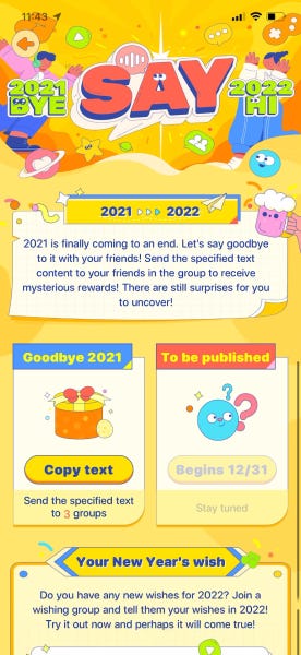 同时上线「新年许愿」活动,用户可以加入群组和 NPC 互动,有机会实现新年愿望。