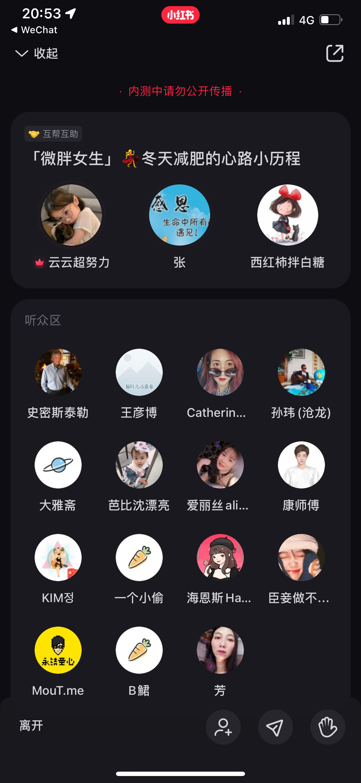 内测用户可从消息列表页顶部进入「现场」,加入或发起类似 Clubhouse 的语音房。