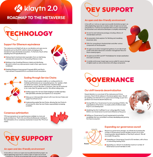 Klaytn 表示,在技术方面,公司提出了支持 DApp 的以太坊等价升级和服务链扩展计划。在开发支持方面,公司宣布计划支持端到端的元宇宙设施,提供生态链浏览器用于获取和可视化数据,提供开源去中心化交易所以方便资产管理,并提供 NFT 市场。关于治理,该公司强调了向权力下放过渡,目标是增加 DAO 治理委员会的参与者数量,之后由 DAO 开发 Klaytn Core。
