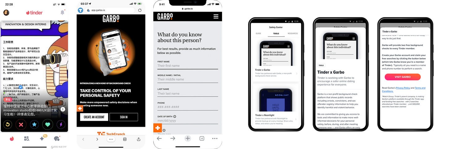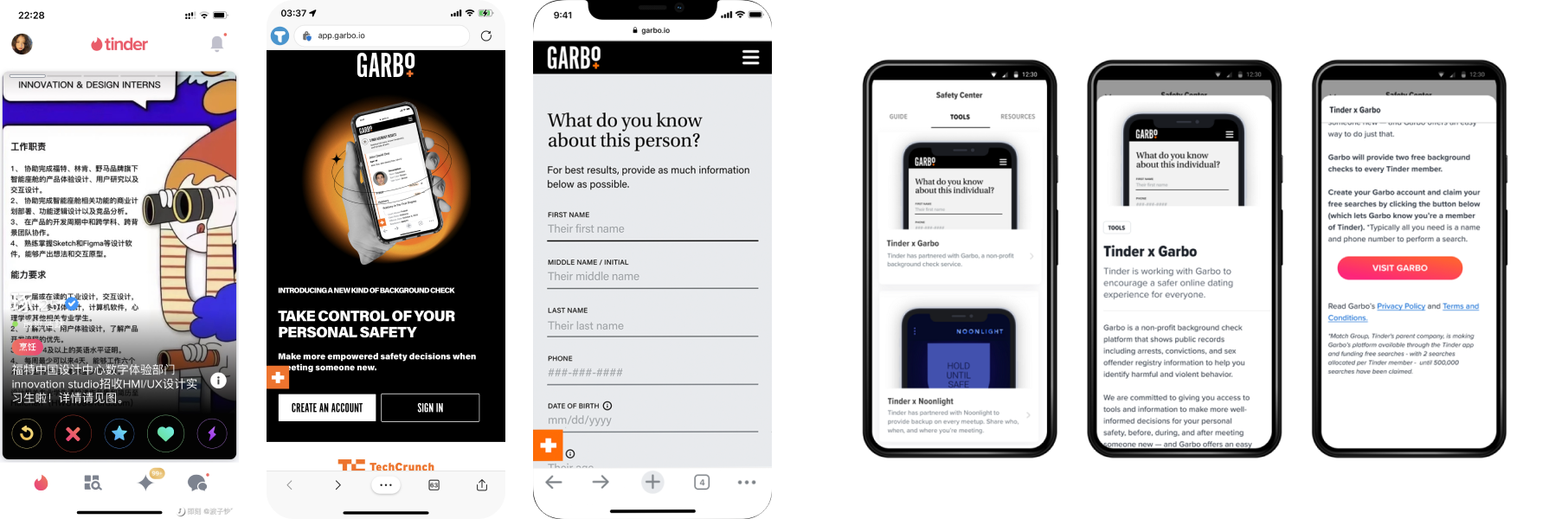 实际上是 Tinder 所在的 Match 集团,想通过此前投资的非营利组织 Garbo,为用户引入背调服务,解决在 ProPublica 和 Columbia Journalism Investigations 于 2019 年的调查报告中指出的 Match 旗下约会软件上的性侵问题。