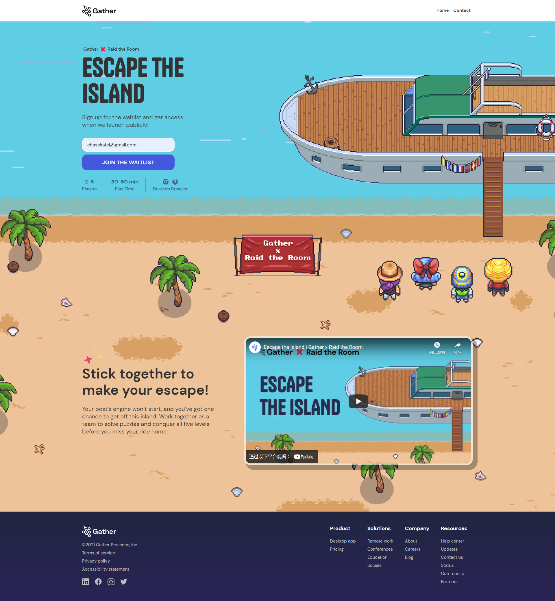 Gather.Town 联合 Raid the Room 发布了一个线上虚拟逃脱房间。用户需要在 Gather 上和 2-6 位好友合作,在 60 分钟内征服 5 个关卡。