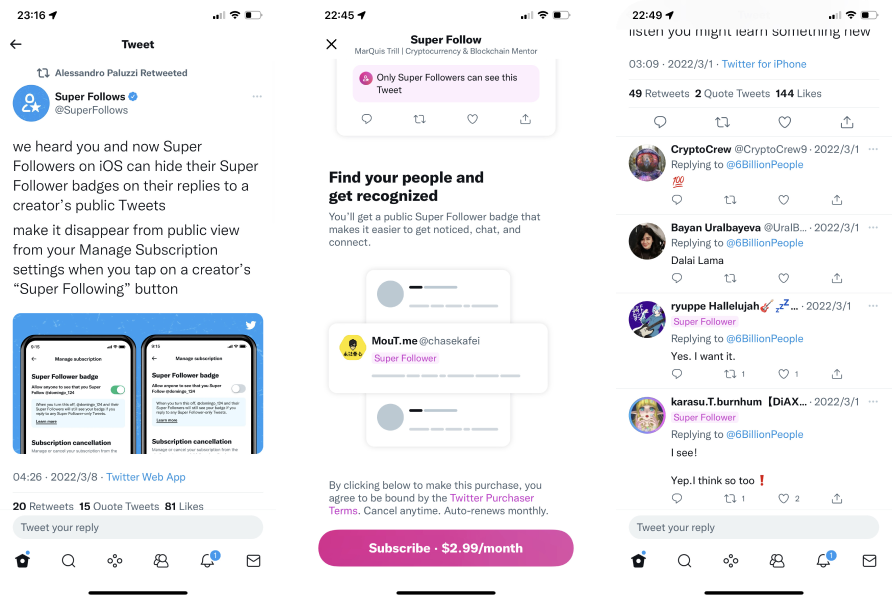 在本刊 Vol.06 有提到过的 Super Follow ,是 Twitter 去年 9 月上线的功能。用户能通过付费订阅成为“超级粉丝”,看到作者提供的“超粉”专属内容,同时“超粉”用户在评论等互动时头像后会跟一个专属徽章。