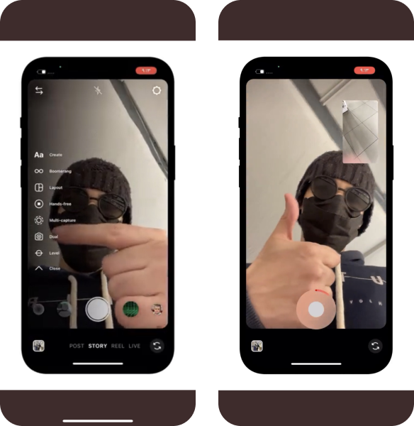 测试 Story 的 “Dual” 选项:用户可在视频中同时录制前后摄像头的内容。