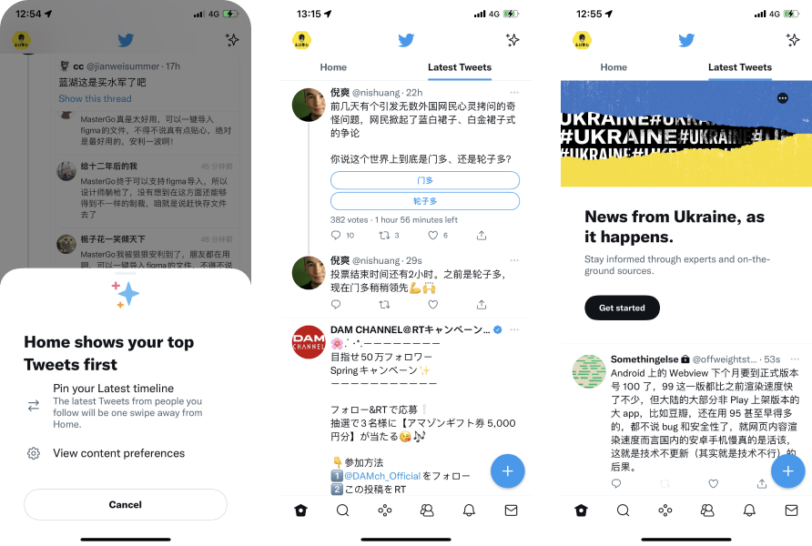 现在,Twitter 把这两种 Timeline 并列了。用户点击 ✨ 后,可以把 Latest Tweets Pin 在首页 Tab 上,通过左右滑动切换。