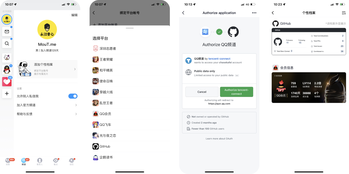 在 QQ 频道的“绑定平台帐号”这个功能中,在一众游戏帐号的簇拥下,出现了个很出戏的 Github……